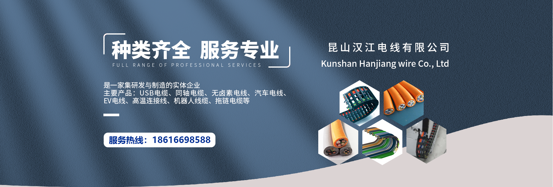 昆山漢江電線有限公司,成立于2012年:公司自成立以來,就致力于為全球計算機、通訊、汽車、筆電、家電、交通、醫療和消費類電子行業提供配套服務,是一家集研發與制造的實體企業。主要產品:USB電纜、同軸電纜、無鹵素電線、汽車電線、EV電線等。
